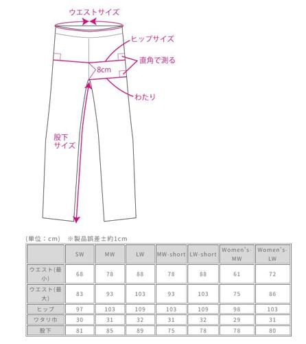 SW(26-32) MW(30-36) LW(34-40) MW-short(30-36/股下70-76cm) LW-short(34-40/股下73-79cm)