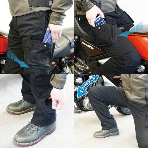 収納に困らない6ポケット装備で、右腿のポケットはステップに足を載せたままでの使い勝手が良いようオフセットされたバイカー仕様になっています。